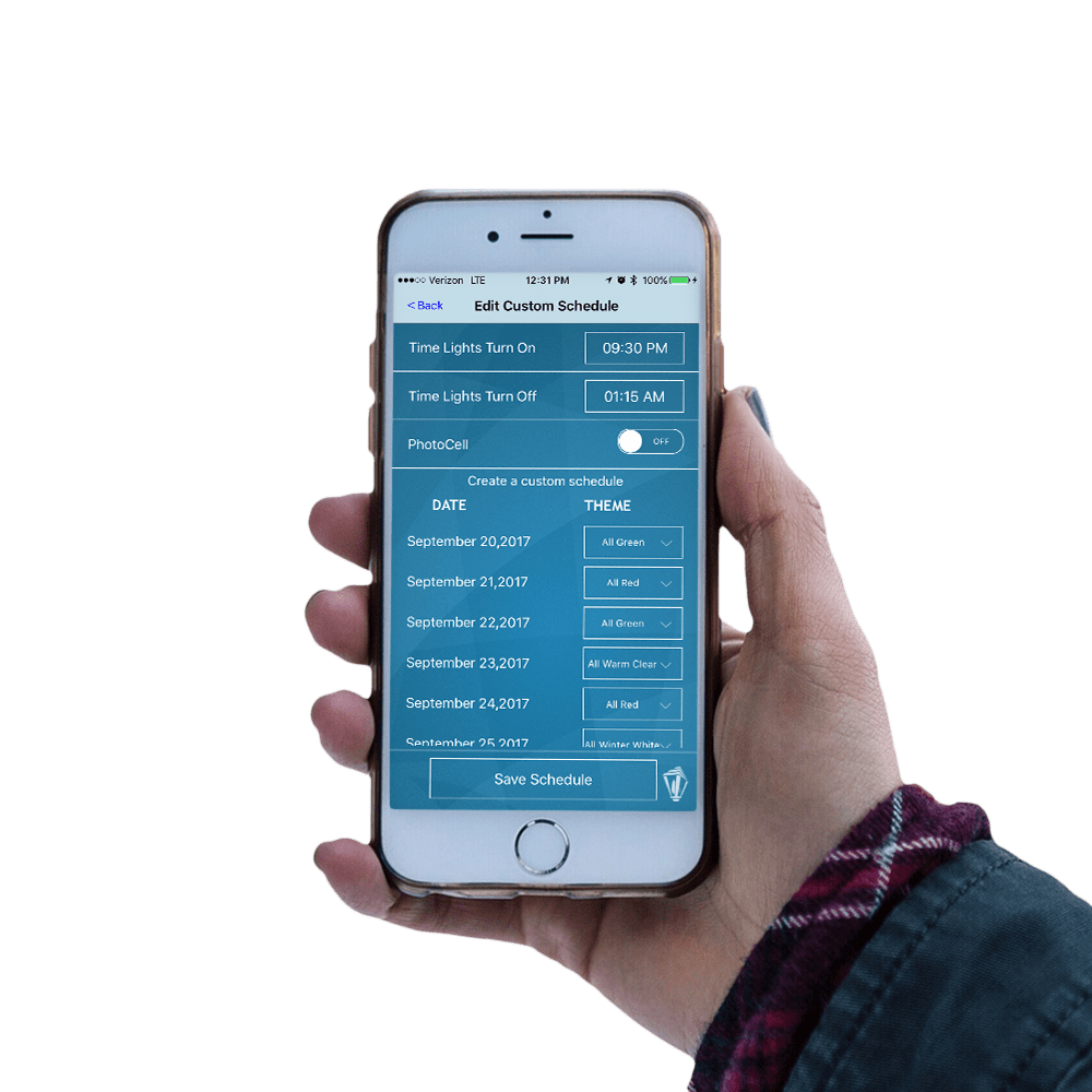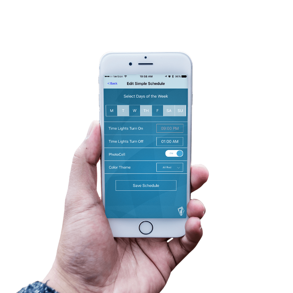 Select a "Time On" time and a "Time Off" time. You can turn on the Photocell feature which will detect when the sun has set and your lights will automatically turn on at this time.